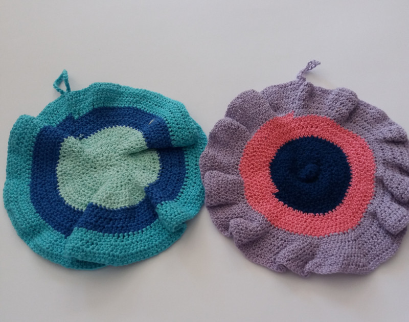 Ručno rađena kuhinjska dekoracija u veselim tonovima.U kompletu su 2 komada. Mogu služiti kao ukras u kuhinji ili kao hvatači,podmetači