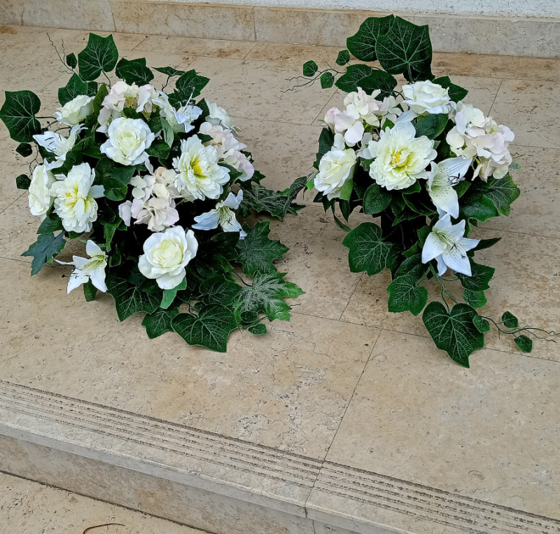 Set aranžmana se sastoji od aranžmana u otežanoj posudi dimenzija 100 x 70 cm i aranžmana u ulošku za vazu promjera 8 cm.Cviječe je umjetno i učvršćeno,
