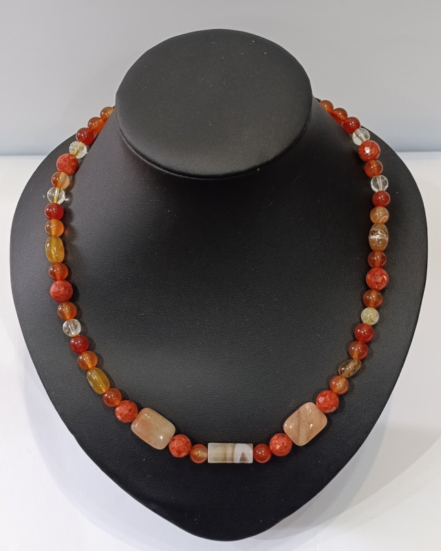 💎 Ogrlica Sklad i Snaga Ahat • Koralj • Karneol • Opal • Citrin ✨ Ahat Snažan zaštitnički kamen koji umiruje i daje osjećaj sigurnosti. Potiče hrabrost, energiju i samopouzdanje, a istovremeno prizemljuje emocije i unosi sklad. Jača kreativnost i intelekt, štiti od štetnih zračenja i donosi sreću. ✨ Koralj Simbol životne energije i strasti. Povezuje s prirodom i unutarnjom snagom. Potiče odlučnost, ustrajnost i materijalnu sigurnost. Idealan za uzemljenje i obnovu vitalnosti. ✨ Karneol Kamen hrabrosti i kreativnosti. Štiti od negativnih emocija, jača volju i donosi radost. Pomaže ostvariti ciljeve, privući sreću i stabilizirati energiju doma. Tradicionalno se koristi za regeneraciju tijela i jačanje vitalnosti. ✨ Opal Nježan kamen inspiracije i duhovnog rasta. Razvija maštu, intuiciju i kozmičku svijest. Potiče pozitivne emocije, donosi lijepe snove i pomaže u procesu osobne transformacije. ✨ Citrin Topao kamen optimizma i uspjeha. Neutralizira negativnu energiju, privlači obilje i podiže samopouzdanje. Odličan za mentalnu jasnoću, fokus i sreću. Podupire probavu i pomaže mirno spavati. 🌿 Ogrlica za obnovu, zaštitu i ispunjenje Nosite je kao svakodnevni podsjetnik na vašu snagu, radost i unutarnji mir.