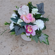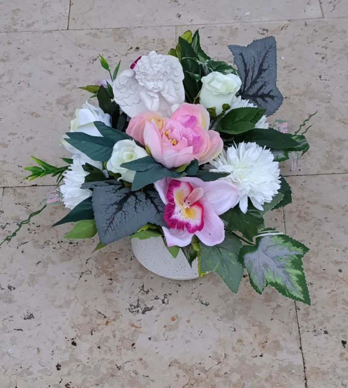 Aranžman je od umjetnog (učvršćenog) u otežanoj posudi.Cvijeće je učvršćeno