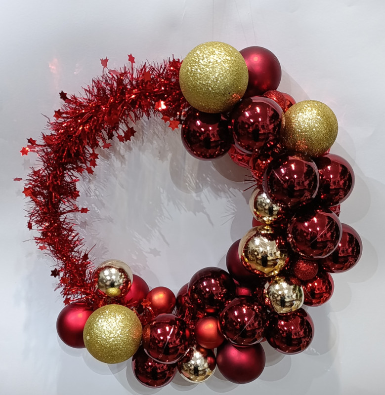 Elegantan božićni vjenčić za vrata u crveno-zlatnoj kombinaciji. Lagan, bogat kuglicama i idealan za blagdanski ugođaj doma. Unesite toplinu i blagdanski ugođaj u svoj dom uz prekrasan božićni vjenčić u crveno-zlatnoj kombinaciji. Izrađen je ručno, s naglaskom na detalje i bogatstvo boja, a lagana konstrukcija omogućuje lako postavljanje na bilo koja vrata. Vjenčić je ispunjen visokokvalitetnim crvenim i zlatnim kuglicama koje stvaraju raskošan, elegantan i svečan izgled. Idealan je za ljubitelje klasičnog božićnog stila ili kao blagdanski poklon.