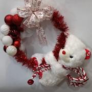 Prekrasan božićni vjenčić u crveno-bijeloj kombinaciji. Ukrašen bijelim medvjedićem, dekorativnim lizalicama i bogatom mašnom. Idealna blagdanska dekoracija za vrata.