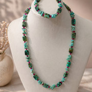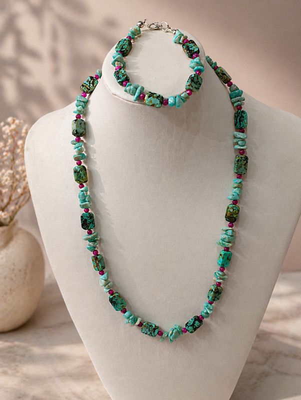 Ovaj profinjeni set narukvice i ogrlice od tirkiza i rubina stvoren je za žene koje ne biraju između snage i nježnosti – već ih nose zajedno.