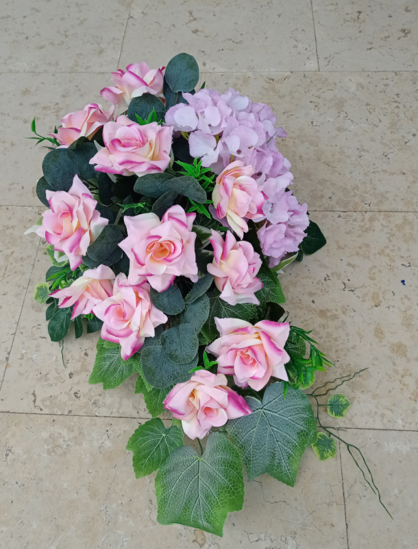 Aranžman je u otežanoj posudi od umjetnog cvijeća. Cvijeće je fiksirano.Dimenzije cca 66cm x 50 cm