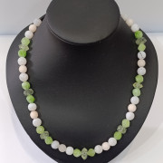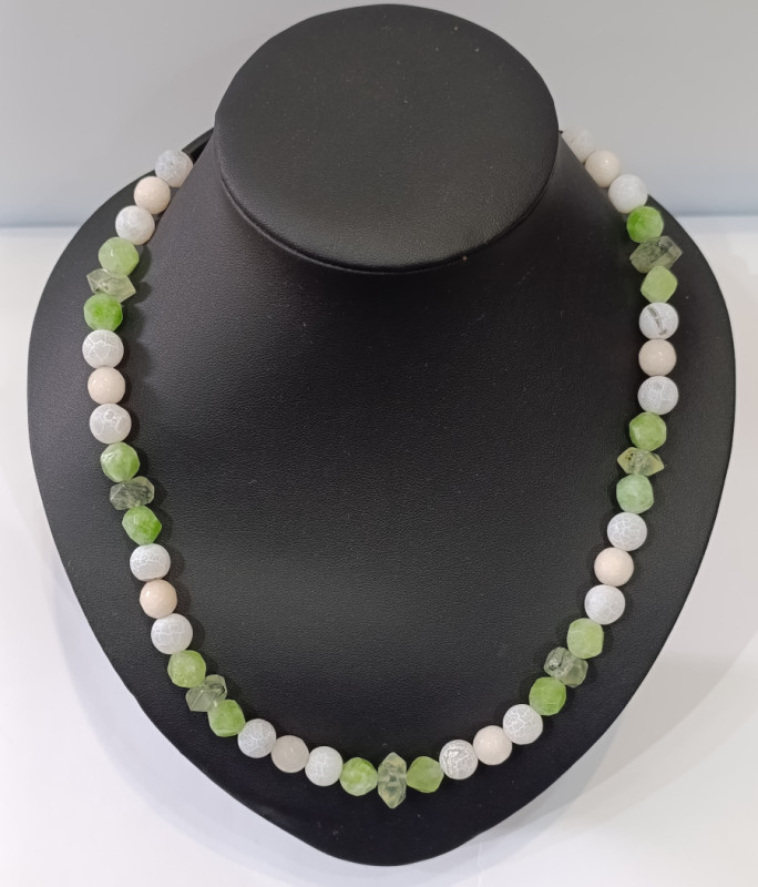 Peridot • Prehnit • Ahat ✨ Peridot Kristal srca i suosjećanja. Donosi emocionalnu ravnotežu, smanjuje stres, ljubomoru i ljutnju. Štiti nositelja stvarajući energetski štit, dok istovremeno unosi obilje, blagostanje i harmoniju – posebno u ljubavne odnose i brak. ✨ Prehnit Moćan zaštitnički kamen poznat i kao “kamen proricanja”. Smiruje um, olakšava tjeskobu i jača unutarnju percepciju. Idealan za meditaciju i duhovnu povezanost. Istovremeno podiže vitalnost i energiju tijela. ✨ Ahat Kamen stabilnosti, hrabrosti i emocionalne jasnoće. Prizemljuje energiju, potiče kreativnost i donosi osjećaj sigurnosti. Njegova nježna snaga umiruje duh i jača fokus. Poznat je i kao kamen sreće i zaštite – osobito od tehničkih zračenja. 🌿 Ova ogrlica nosi energiju srca, ravnoteže i intuicije. Idealna je za one koji traže unutarnji mir, duhovnu povezanost i zaštitu od svakodnevnog stresa.