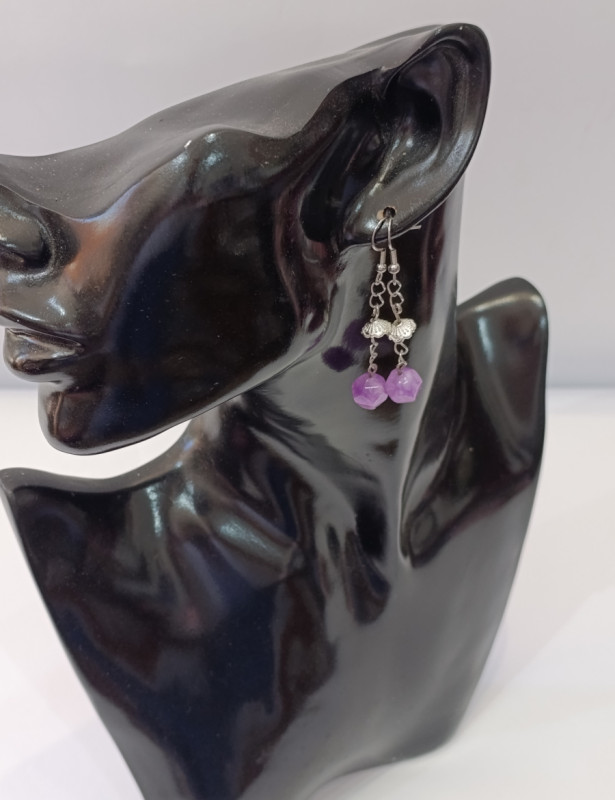 Naušnice duljina 6 cm i lagane .Ametist je koristan ako imamo pravnih poteškoća i novčanih problema jer može dovesti do blagostanja i obilja.Dosta se koristio i kao zaštita za putnike.Pomaže kod glavobolja,nesanice,artritisa, olakšava bolove,povoljno djeluje na cirkulaciju,kronični umor,imunitet
