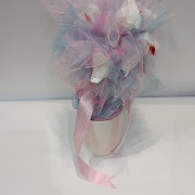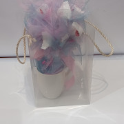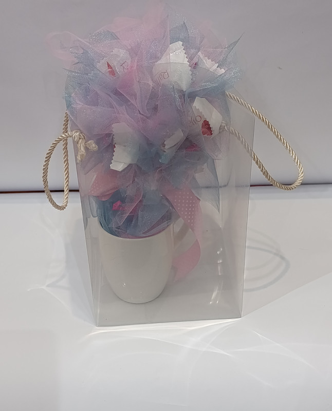 Ručno izrađen poklon aranžman elegantno je upakiran u prozirnu kutiju s dekorativnim zlatnim ručkama od užeta, što mu daje profinjen i svečan izgled. U središtu se nalazi bijela keramička šalica, ispunjena bogatim, ručno složenim ukrasom od tila u nježnim pastelnim nijansama ružičaste, plave i ljubičaste boje. Aranžman je dodatno obogaćen dekorativnim trakama i slatkišima, pažljivo raspoređenima kako bi stvorili dojam raskošnog buketa. Kombinacija prozračnih materijala i romantičnih tonova daje poklonu nježan, unikatni karakter. Idealan je kao poklon za rođendan, Dan žena, Majčin dan, učiteljice ili kao znak pažnje dragoj osobi. Svaki detalj izrađen je ručno s posebnom pažnjom, što ovaj poklon čini posebnim i drugačijim od klasičnih darova.