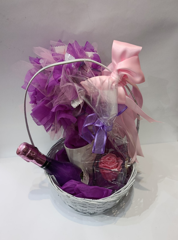 Poseban poklon koji spaja eleganciju, slatko iznenađenje i trajnu uspomenu. Savršen za trenutke koje želite učiniti nezaboravnima. Set sadrži: dekorativnu košaru malu bocu šampanjca 🍾 dehidriranu ružu u staklenoj vazi 🌹 dekorativni buket drvce izrađen od slatkiša u ljubičastim nijansama šalicu s ručno pisanim natpisom