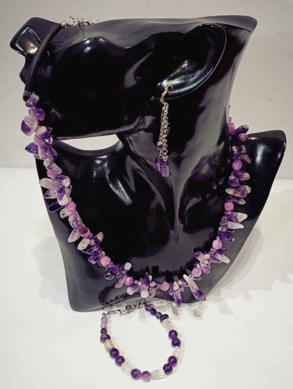 Set nakita od ametista i gorskog kristala – MelAureus Narukvica, ogrlica i naušnice | ručni rad | unikatni kristalni nakit Postoje trenuci kada želimo nositi nešto više od nakita – nešto što nosi značenje, energiju i priču. Set nakita MelAureus od ametista i gorskog kristala nastao je upravo iz te ideje. Svaki komad u setu – narukvica, ogrlica i naušnice – izrađen je ručno, s pažnjom prema detaljima i ljubavlju prema prirodnim kristalima. Zbog prirodne strukture kamenja i ručne izrade, svaki set je unikatan i nosi vlastitu, posebnu energiju. Kombinacija ametista i gorskog kristala simbolizira ravnotežu, jasnoću i unutarnji mir. To je nakit koji nježno podsjeća da u svakodnevici uvijek postoji prostor za tišinu, svjesnost i vlastitu snagu. Ovaj set može biti elegantan dodatak svakodnevnom stilu, ali i poseban poklon s dubljim značenjem.