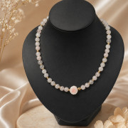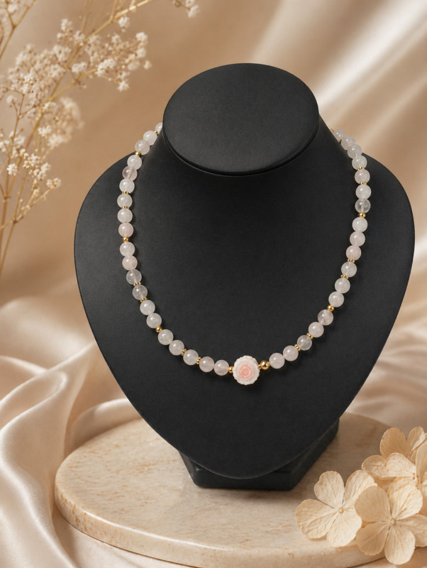 Ova elegantna ogrlica spaja profinjenu energiju ružičastog kvarca i smirujuću snagu ahata, stvarajući suptilan, ali moćan simbol ravnoteže i unutarnje harmonije.