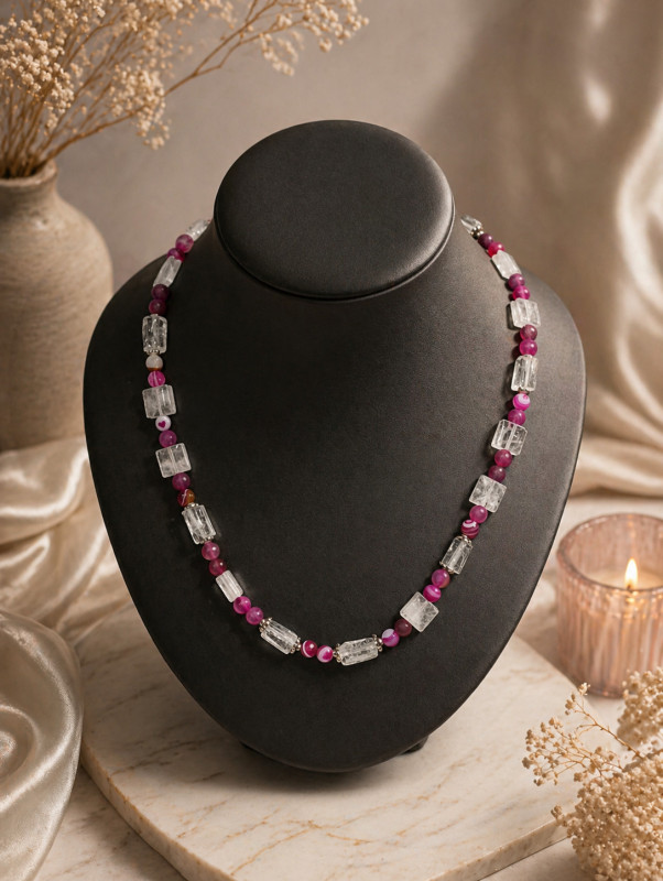 Ova ručno rađena ogrlica od gorskog kristala i ahata nosi u sebi sklad dvije snažne energije – čistoću misli i stabilnost duha. Dizajnirana s pažnjom, predstavlja više od nakita – postaje osobni simbol ravnoteže i unutarnje snage.